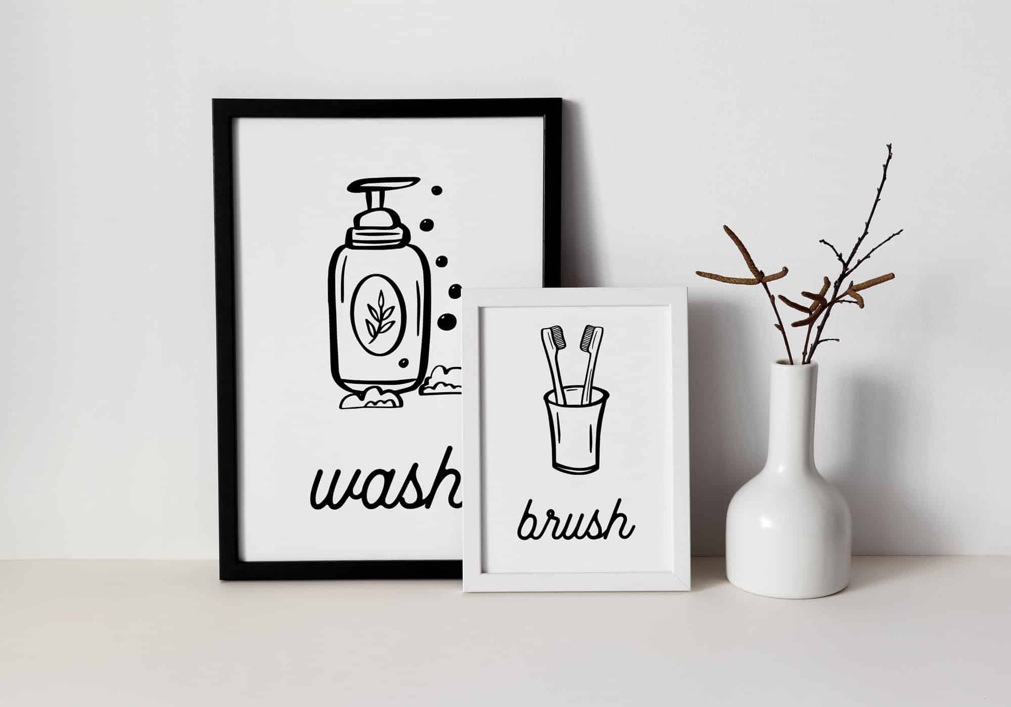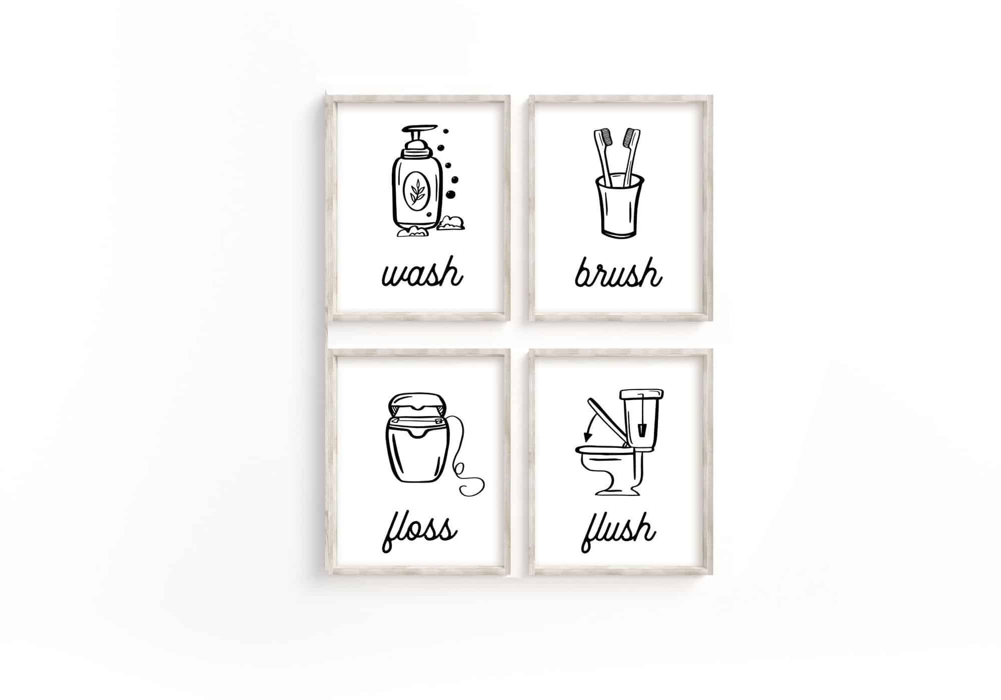 Transform your bathroom into a sanctuary with our stunning set of 4 “Wash Brush Floss Flush” wall art prints. Each print features a sleek and minimalist design, adding a touch of elegance to your space. With its timeless appeal, this collection seamlessly blends with any decor style. Crafted with high-quality materials, these prints are durable and long-lasting. Instantly downloadable, they offer a convenient solution for refreshing your bathroom decor. Upgrade your home with this chic and modern bathroom wall art set today!