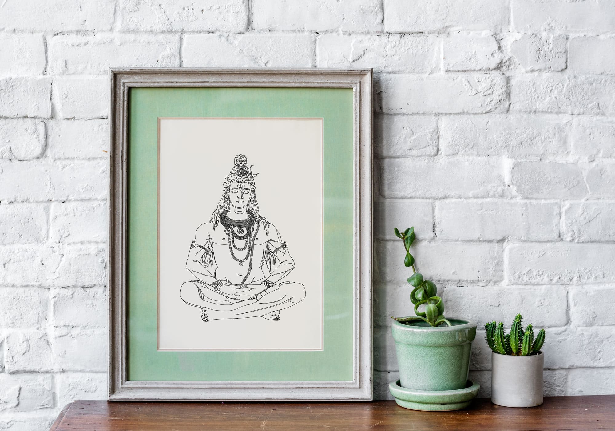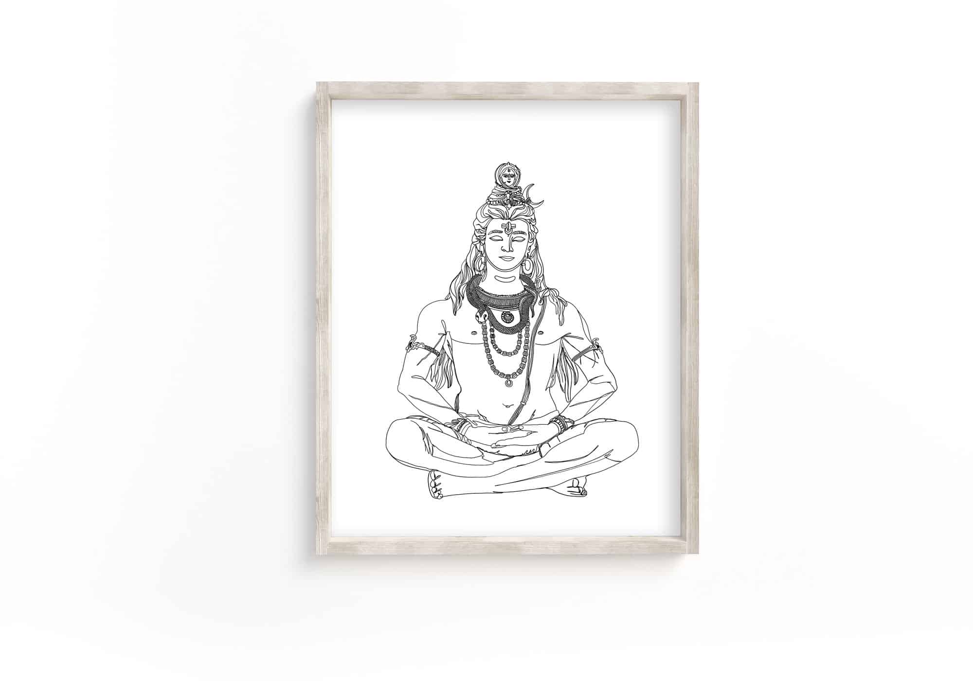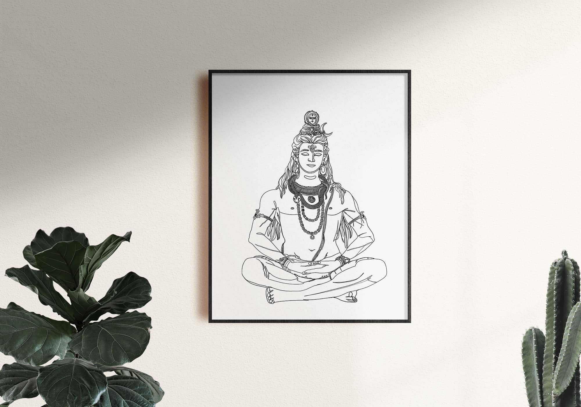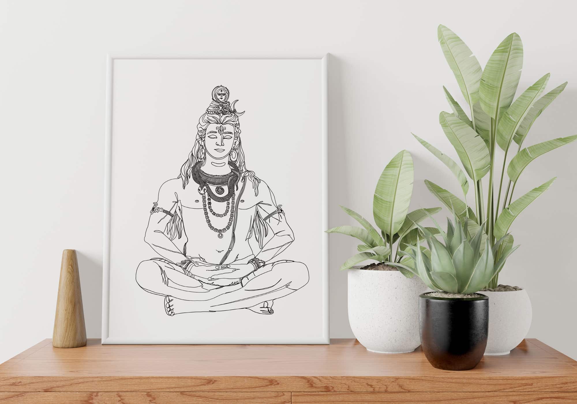 Enhance your space with the divine presence of Lord Shiva through this exquisite line drawing, designed to infuse your surroundings with spiritual serenity and artistic elegance. Perfect for meditation rooms, yoga rooms, or any area where you seek a touch of tranquility, this piece of art embodies the essence of spiritual enlightenment. Transform your yoga room or meditation room into a sanctuary of peace and spiritual energy with this beautiful Lord Shiva line drawing. Download now and bring the divine art of meditation and mindfulness into your everyday life.