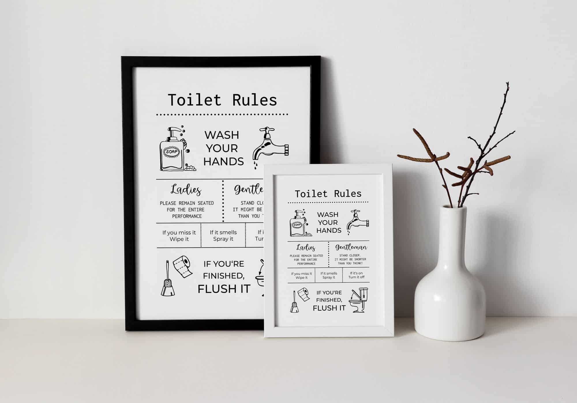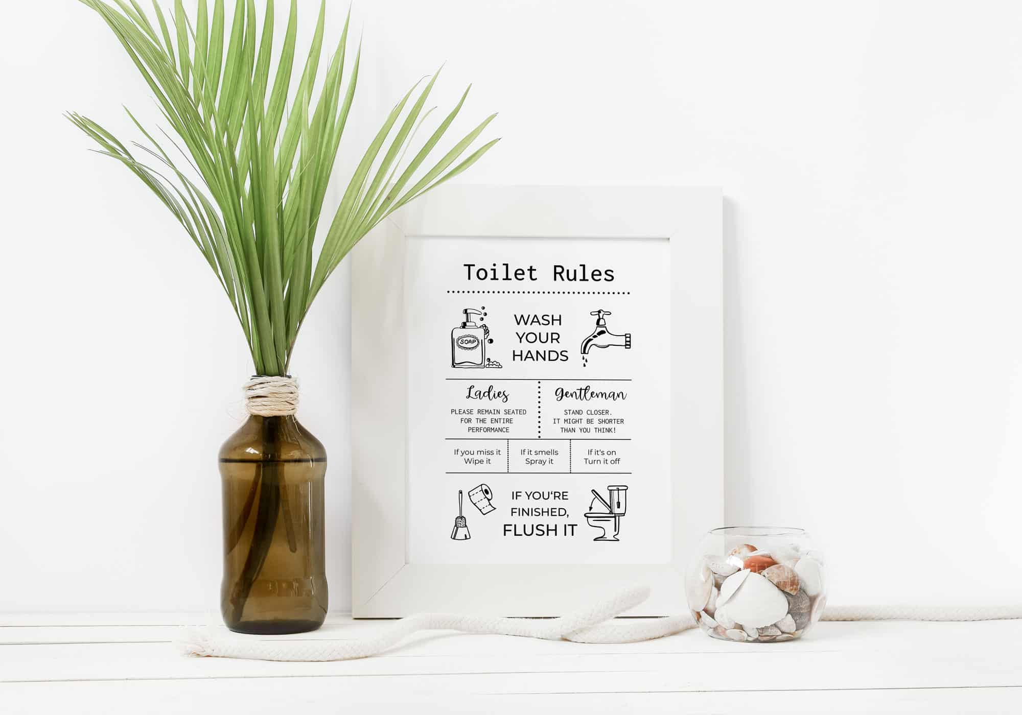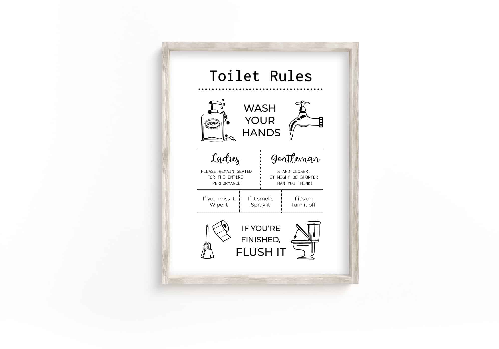 Elevate your bathroom with our comprehensive collection of toilet signs and bathroom rules. From humorous to practical, our range includes toilet door signs, funny toilet signs, and flush toilet signs, all available for instant download. Ensure your bathroom decor is both stylish and functional with our WC signs and bathroom rules.