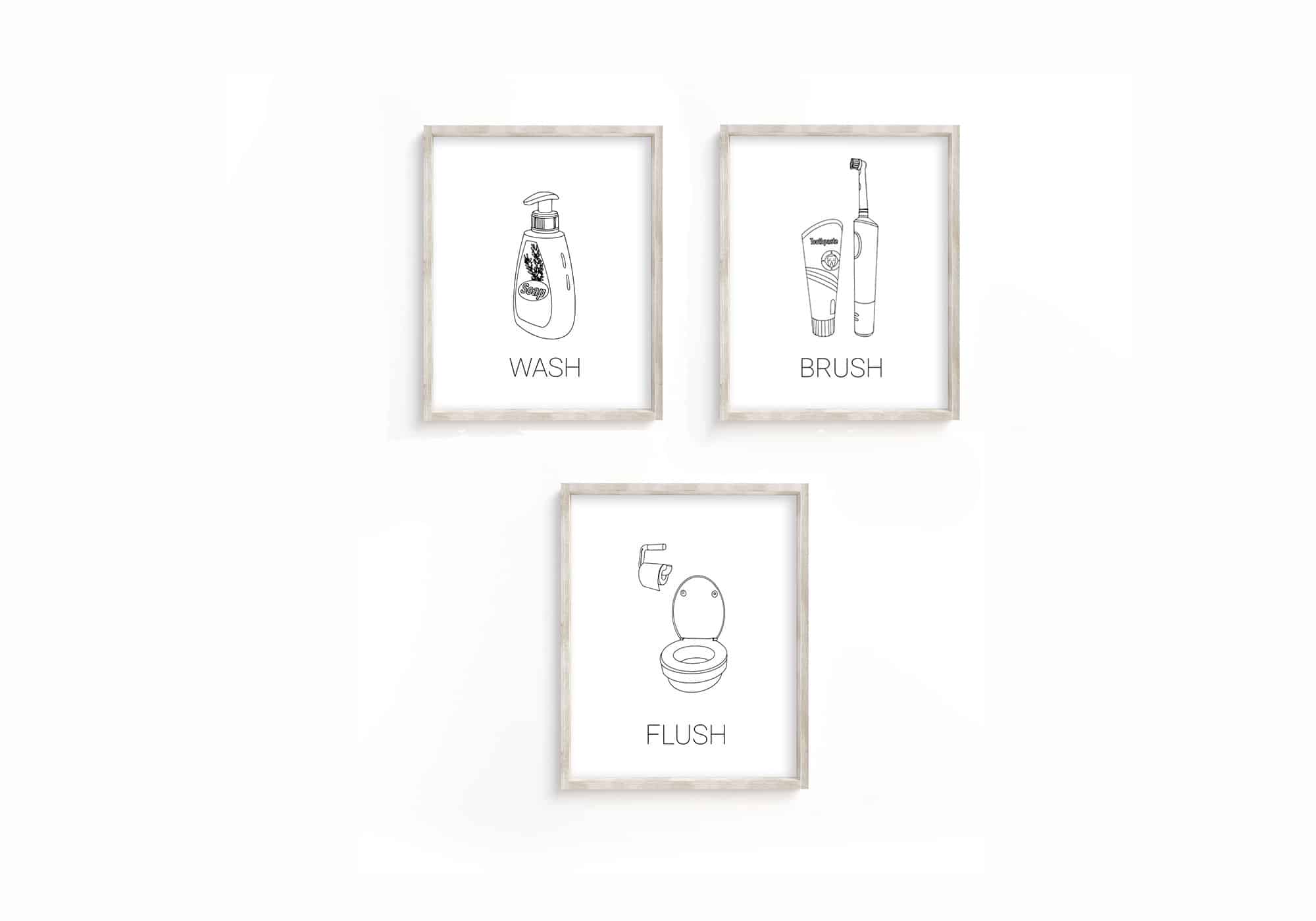 Transform your bathroom into a stylish retreat with our set of 3 “Wash Brush Flush” prints. Featuring minimalist designs in a sleek black and white palette, these prints add a touch of sophistication to any bathroom wall. Crafted with high-quality materials, they are durable and long-lasting. Instantly downloadable, these prints offer a convenient solution for updating your bathroom decor. Elevate your space with this chic and modern bathroom wall art set today!