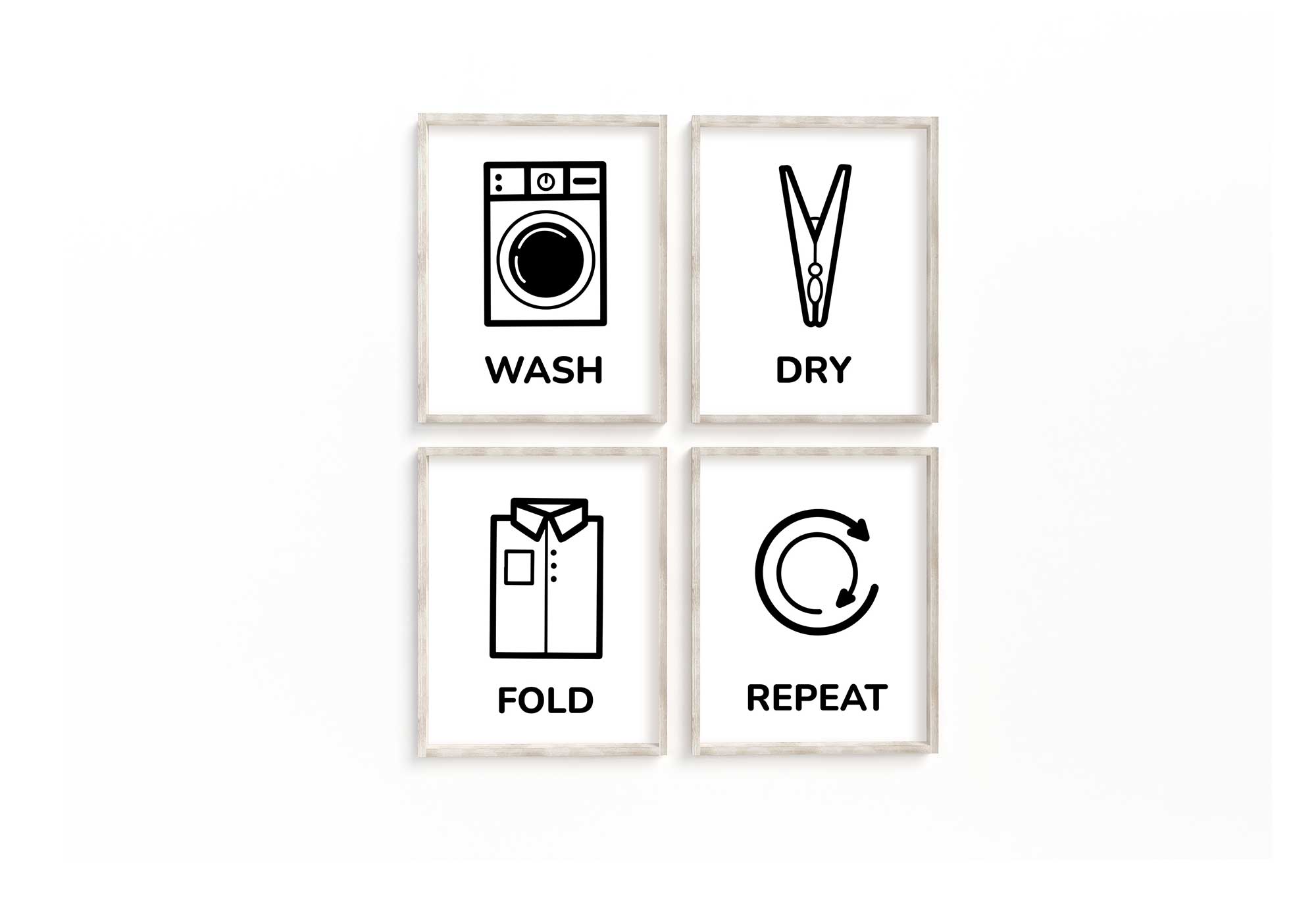 - Set of 4 Prints: Each set includes four beautifully designed prints, each showcasing a different step in the laundry process: Wash, Dry, Fold, Repeat.