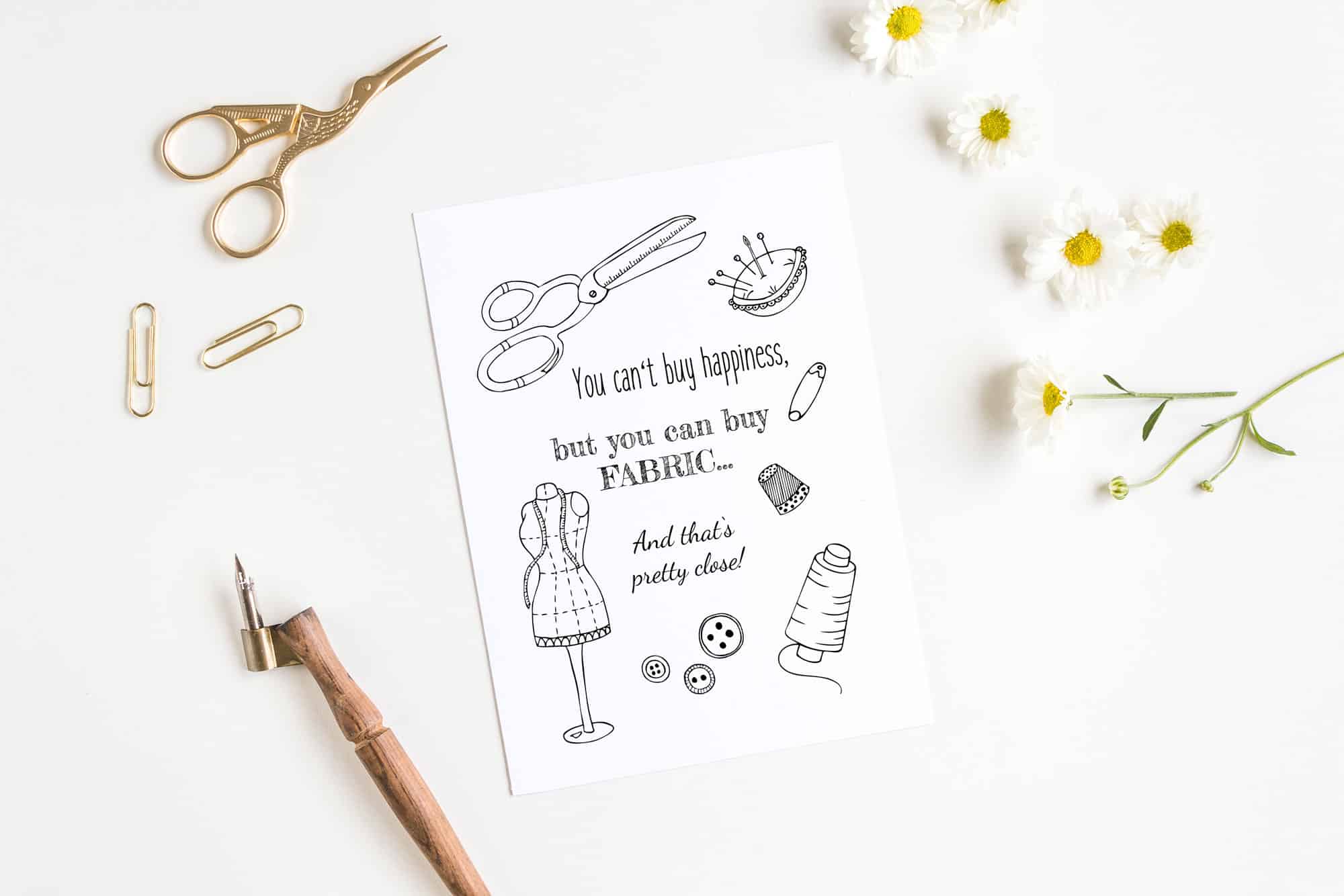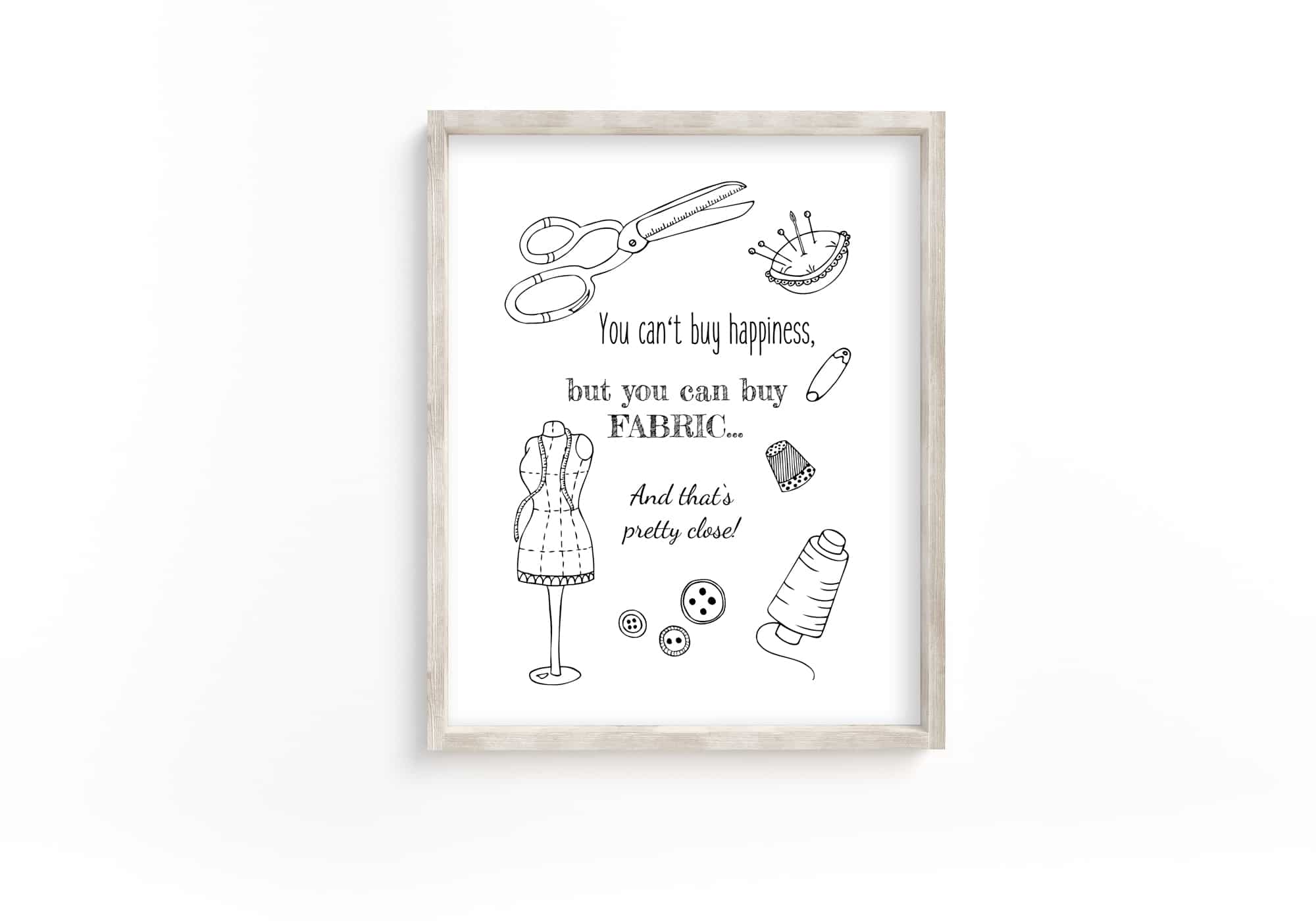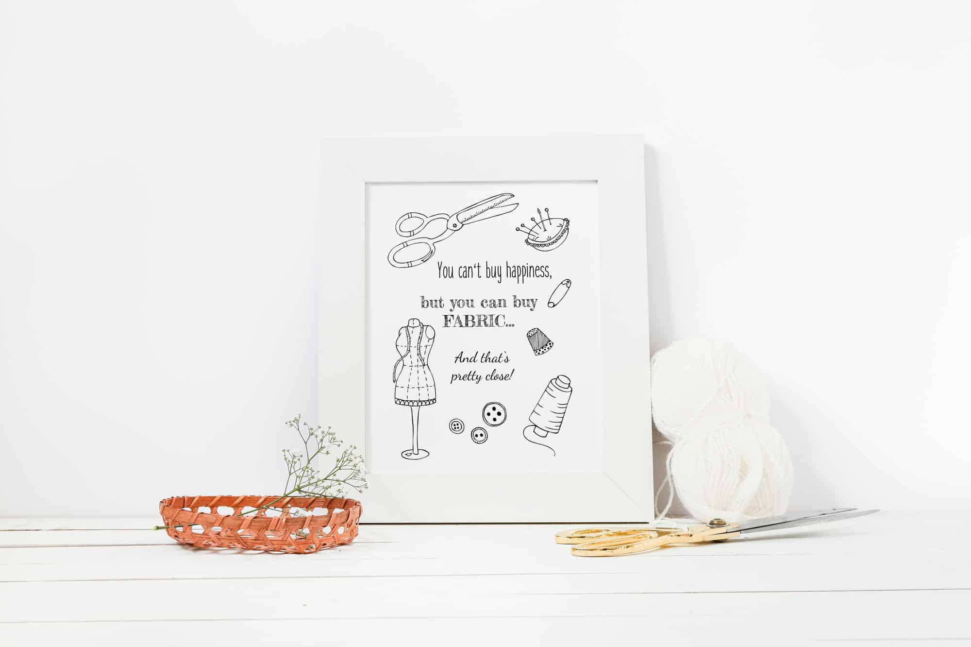 Transform your sewing room into a haven of creativity with our “You Can’t Buy Happiness” digital printable. This charming artwork celebrates the joy of sewing with a heartfelt quote and whimsical elements like scissors, thread, thimble, and a dress form. Whether you’re decorating your own space or looking for a thoughtful gift for a sewing enthusiast, this print adds warmth and inspiration to any sewing room decor.